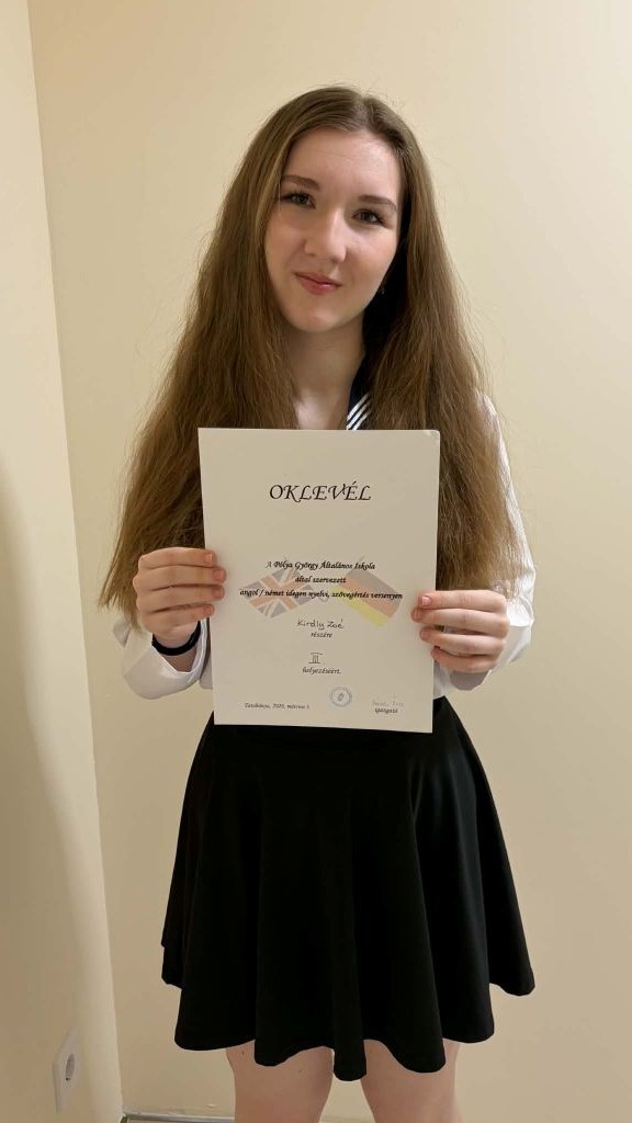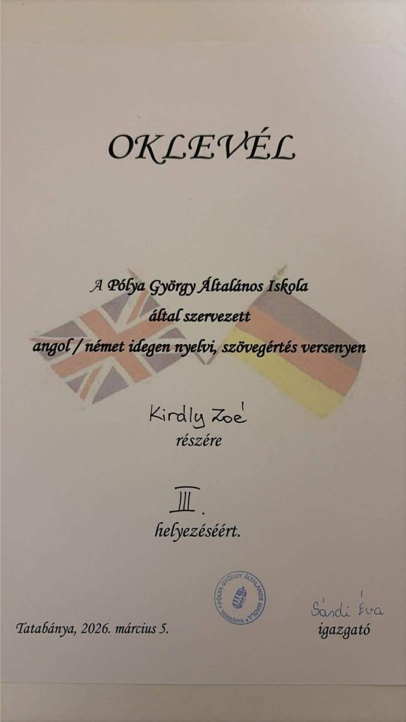 Király Zoé Lídia (8. a) a Pólya György Általános Iskola által szervezett német nyelvi szövegértés versenyen 3. helyezést ért el.