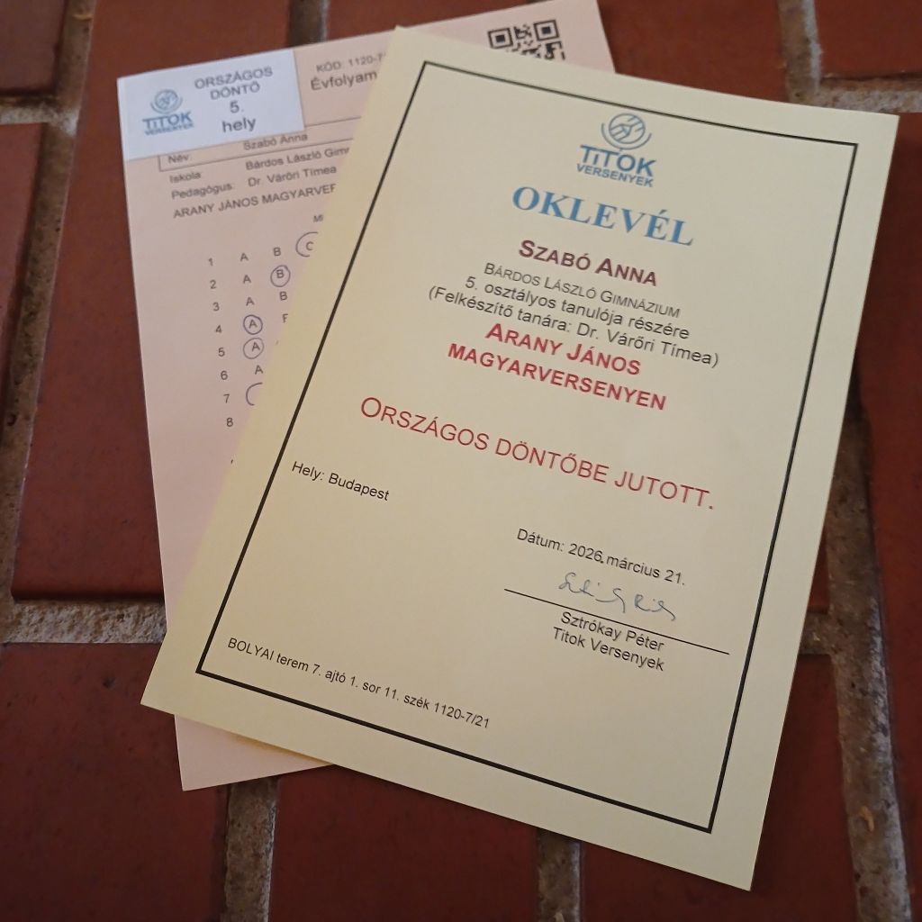 Egy újabb fantasztikus eredmény! Szabó Anna (5. a) 5. helyezést ért el az Arany János magyarverseny országos döntőjében!